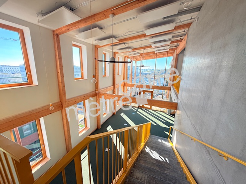 Les deux bâtiments de quatre et six étages du programme déploient une surface globale de travail de 4 500 m². Chaque plateau peut y accueillir soit un open space, soit des bureaux cloisonnés (selon une trame de 2,7 m), autour d’espaces en double hauteur propices aux moments de partage.